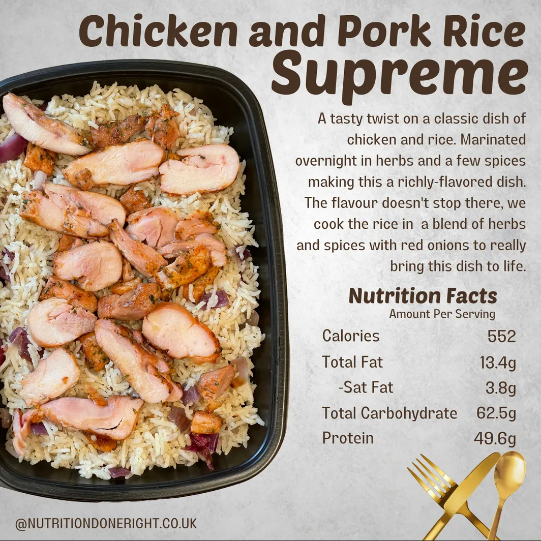 Indulge in the savory flavors of our Chicken and Pork Rice Supreme. Packed with a perfect balance of proteins and nutrients, our take on the classic chicken and rice prep every bodybuilder makes... this dish is a delicious and satisfying meal option for anyone looking to get more out of their meals.