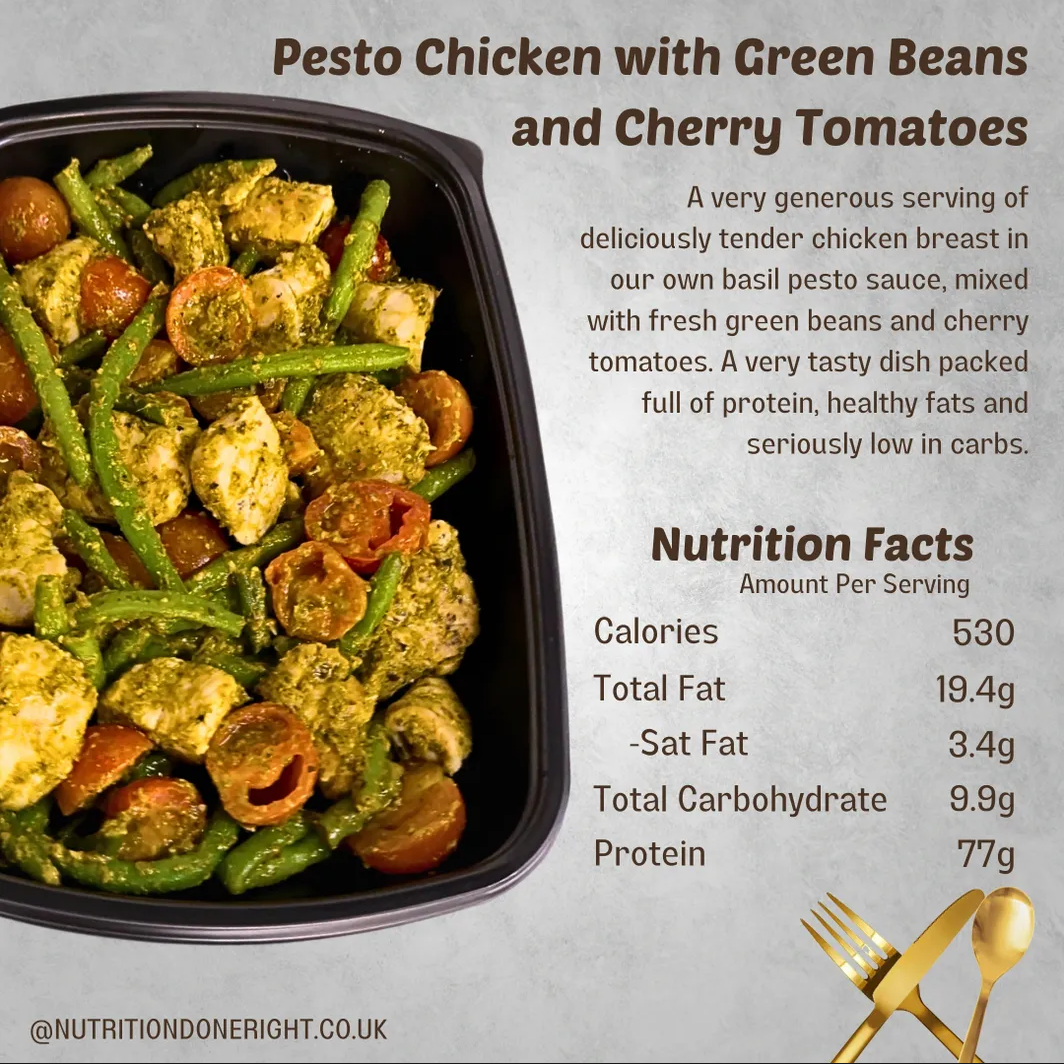 Indulge in our delicious Pesto Chicken with Green Beans and Cherry Tomatoes, a harmonious blend of savory flavours to treat your taste buds. Made with fresh, high-quality ingredients, this dish not only tastes great but is also very nutritious. Packed with protein, vitamins, and minerals, it is a wholesome choice and a satisfying meal.